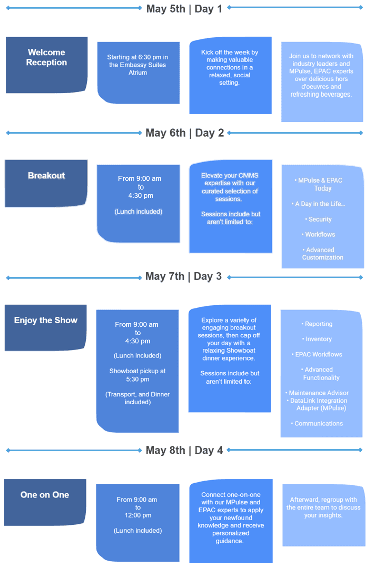 Dive into an informative introduction from MPulse Directors and explore your CMMS in more depth during smaller breakout sessions tailored to your chosen topics.